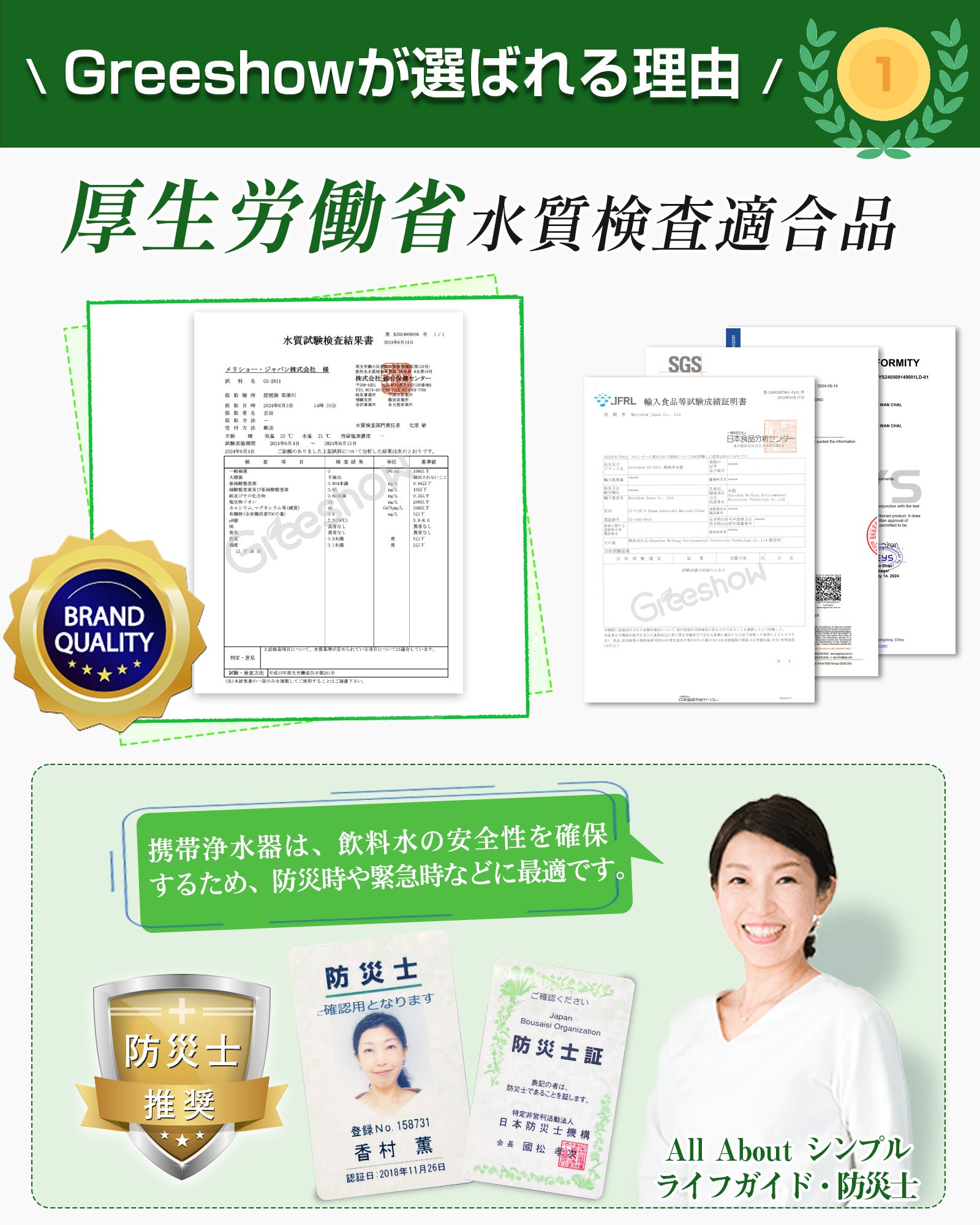防災士推奨|国際SGS、厚生労働省水質検査適合品&PSE認証取得|防災安全協会推奨品